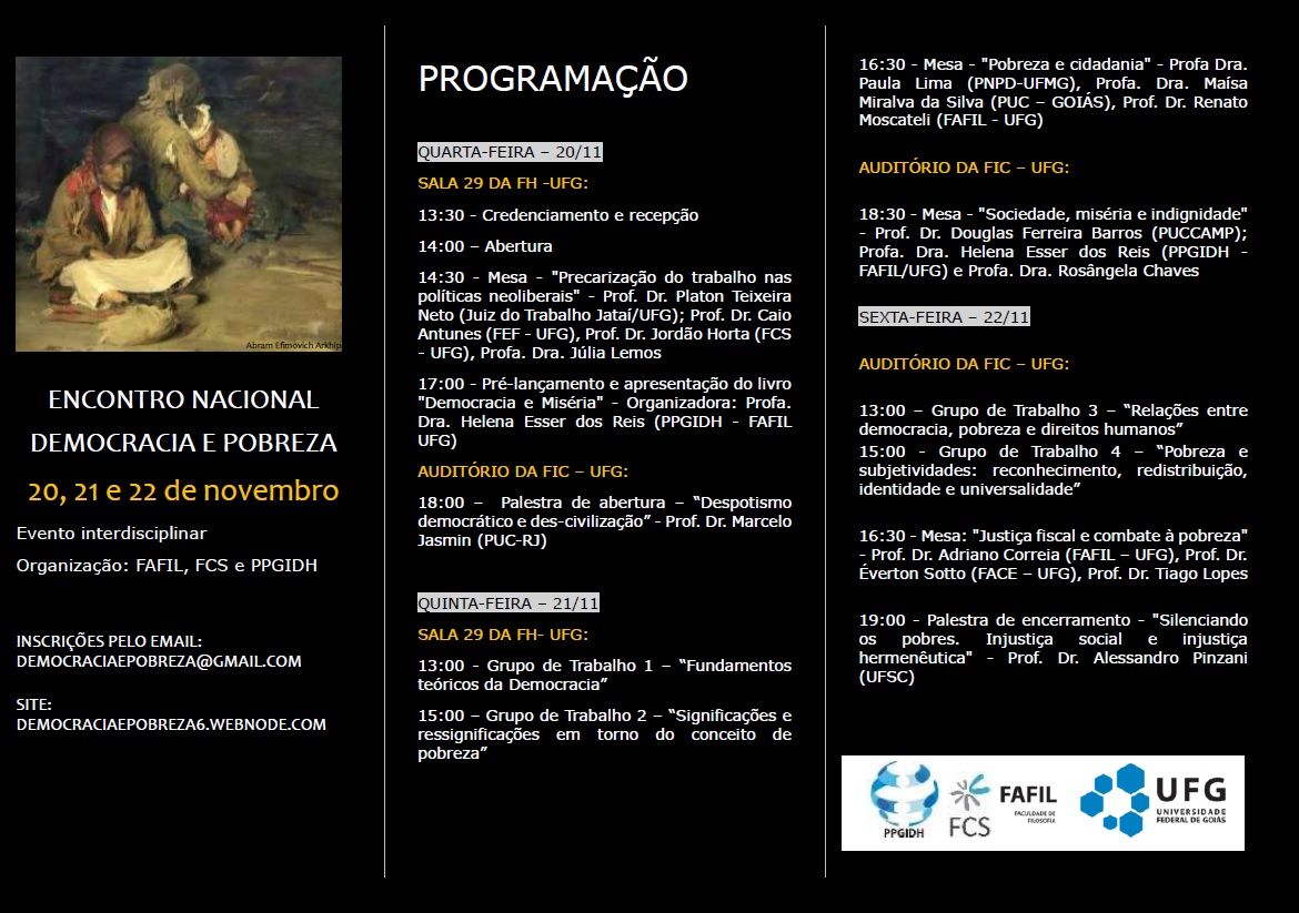 A primeira edição do Encontro Internacional Democracia e Pobreza, a ser realizada na cidade de Goiânia (GO), de 20 a 22 de novembro de 2019, traz à tona um tema de enorme relevância no mundo contemporâneo: a relação entre a crise do modelo democrático e o aumento brutal da desigualdade econômica e social. Nos três dias do encontro, a proposta é reunir pesquisadores (as) de renome internacional, professores (as), estudantes, de diversas áreas do conhecimento, além de membros da comunidade, para refletir e debater sobre as ameaças que pairam sobre a democracia e as saídas para a sua preservação, que passam pela discussão de formas de combate à pobreza e sobre os caminhos para assegurar aos mais pobres o exercício efetivo da cidadania. Acesse o site do evento para mais informações.