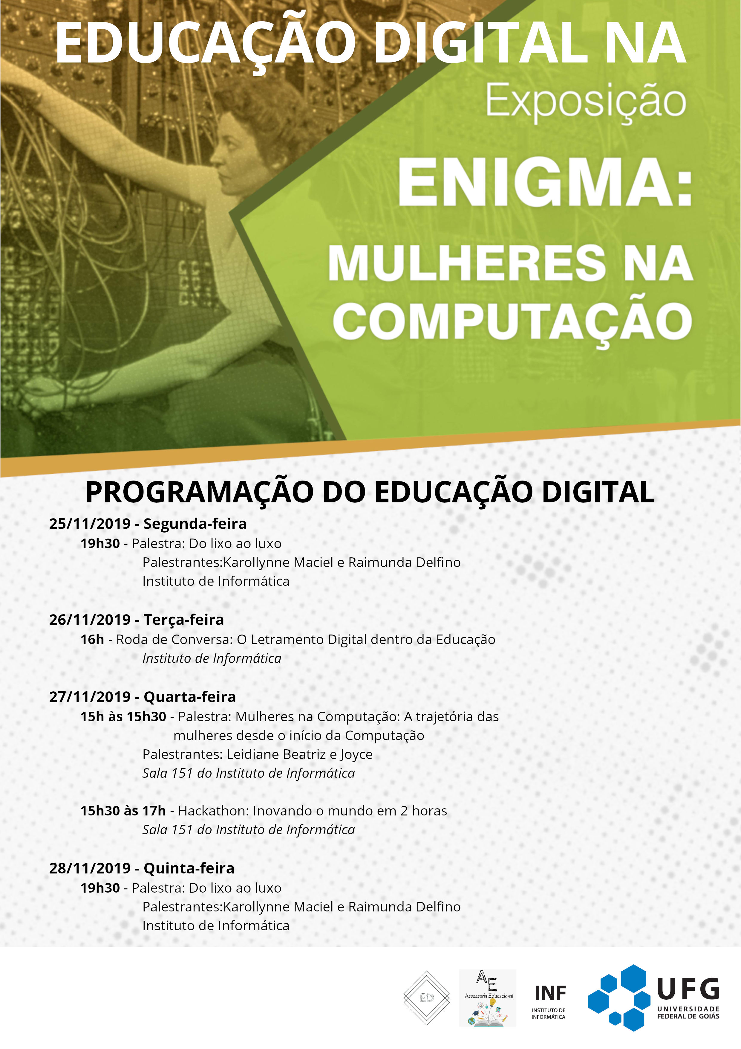 Exposição Enigmas promove atividades sobre Educação Digital Ereignis Local: Instituto de Informática da UFG - Câmpus Samambaia Ereignisperiode : 25 - 28 November, 2019 TweetWhatsApp Alle auflisten zurück