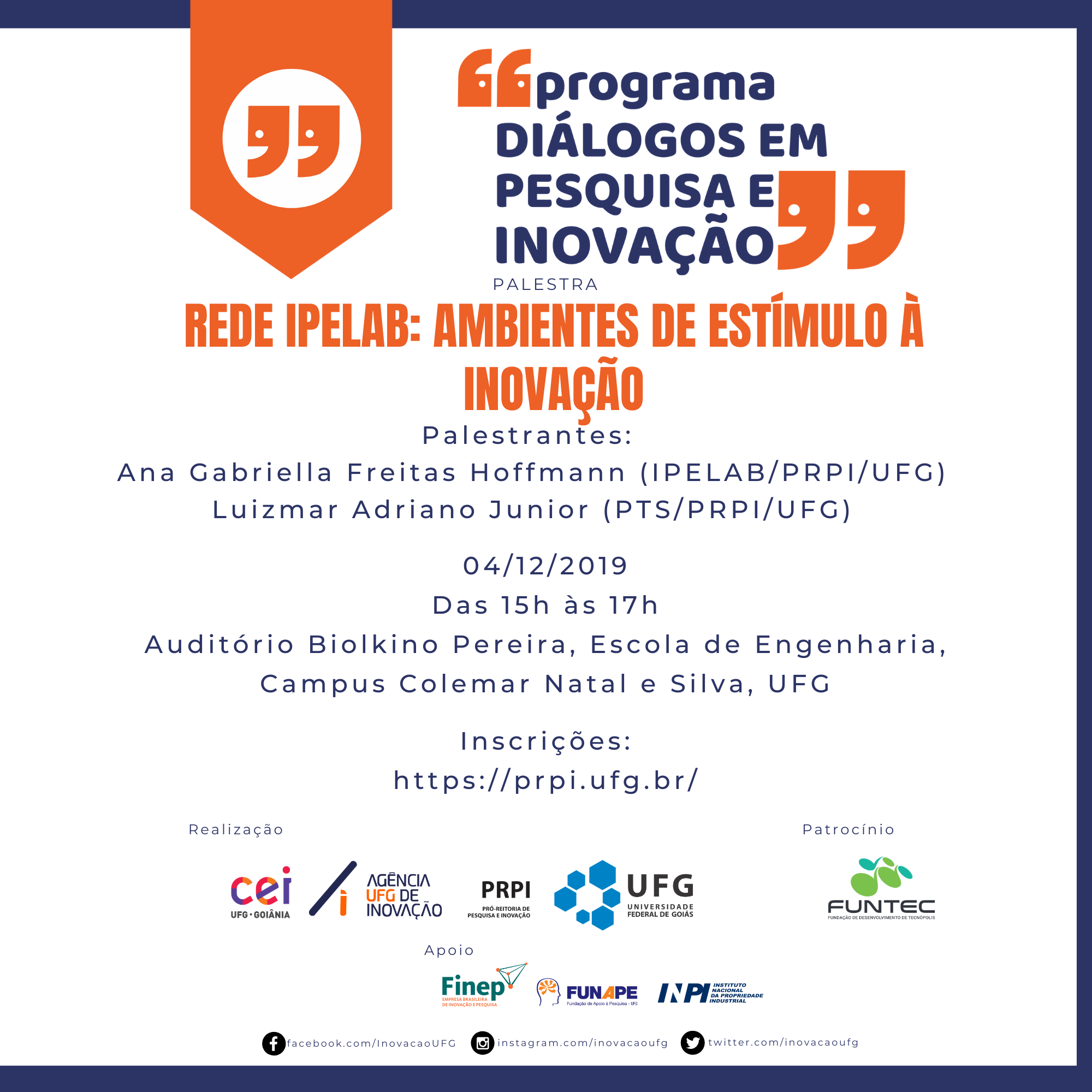 A Pró-Reitoria de Pesquisa e Inovação, no âmbito do Programa Diálogos em Pesquisa e Inovação, convida a todos para a palestra Rede IPELAB: ambientes de estímulo à inovação.