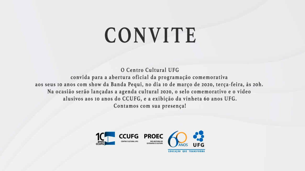 Comemoração dos 10 anos do Centro Cultural UFG Evento Local: Centro Cultural UFG Fecha del Evento : 10 Marzo 2020 a las 20:00 TweetWhatsApp Todas las páginas Volver