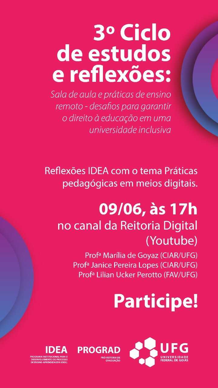 3º Ciclo de estudos e reflexões Evento Local: Canal da UFG Ofical (Youtube) Data evento : 09 giugno 2020 alle 17:00 TweetWhatsApp Elenca tutto Volver