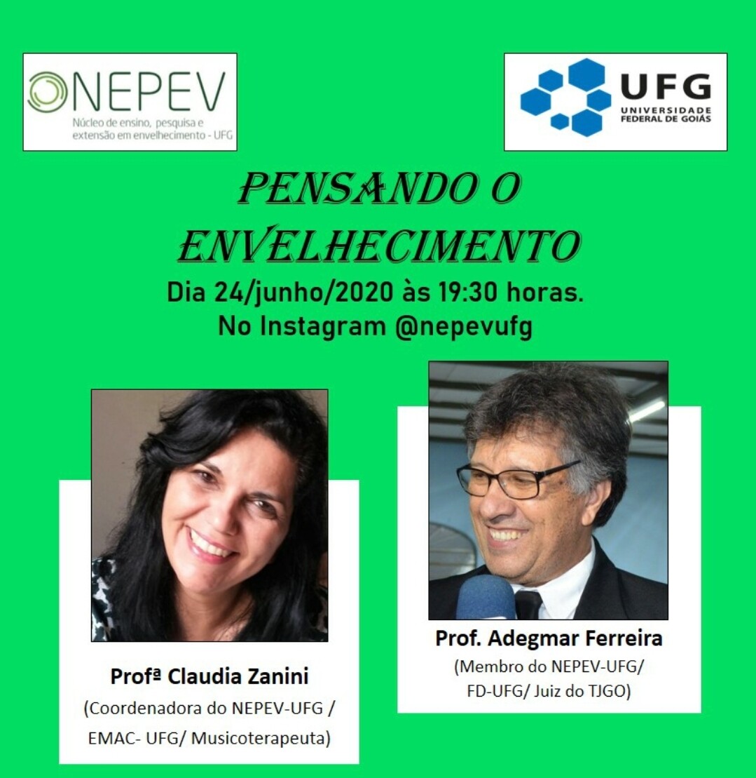 O Núcleo de Ensino, Pesquisa e Extensão em Envelhecimento da Universidade Federal de Goiás (Nepev/UFG) tem, entre seus objetivos, promover a discussão sobre temática do envelhecimento de uma forma transversal na Universidade e proporcionar espaços de discussão junto à sociedade. A partir de junho de 2020, o Nepev-UFG iniciará uma série intitulada "Pensando o Envelhecimento" com a participação de membros do Núcleo, da comunidade universitária da UFG e de convidados de diferentes áreas de atuação profissional, tendo sempre em foco as necessidades advindas do crescimento populacional pois, segundo o Instituto Brasileiro de Geografia e Estatística (IBGE), em 2050,  a  população de pessoas idosas no Brasil será maior que a população infantil. A primeira edição terá a participação da professora Claudia Zanini, coordenadora geral do Nepev-UFG, docente do Curso de Musicoterapia da UFG, e do professor Adegmar Ferreira, membro do Nepev-UFG e docente do curso de Direito da UFG, além de juiz do Tribunal de Justiça do Estado de Goiás (TJ-GO). Entre os assuntos, o encontro abordará o tema do mês: Junho Violeta, dedicado à conscientização do combate à violência contra a pessoa idosa.