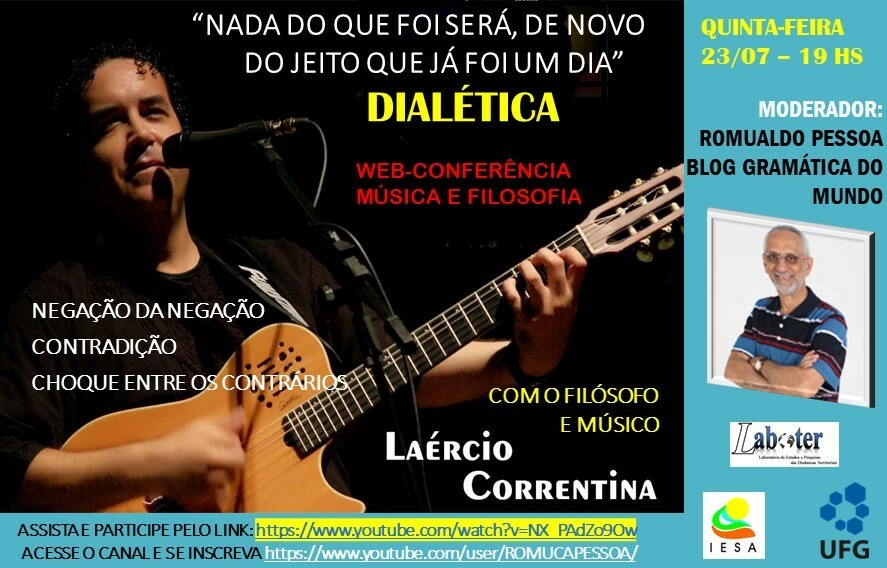 O projeto de extensão Gramática no Mundo, do Instituto de Estudos Sócioambientais (IESA/UFG), convida toda a comunidade para participar da web-conferência com o músico e filósofo Laércio Correntina, no dia 23/7 às 19h. Os participantes receberão certificado.