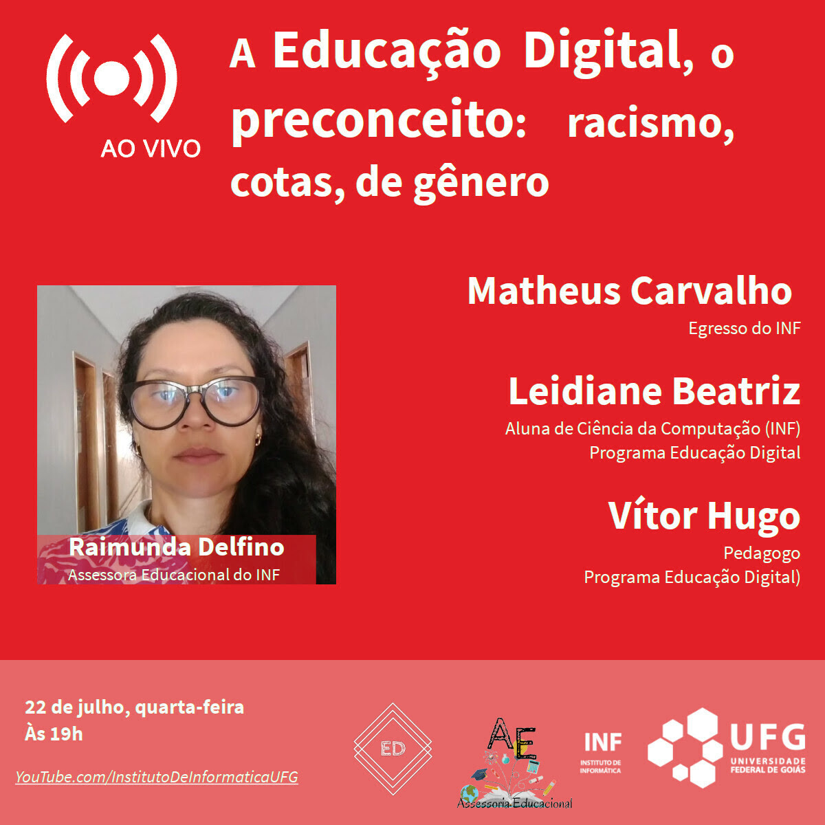 Palestra "Educação digital, o preconceito: racismo, cotas de gênero" Ereignis Local: YouTube - Instituto de Informática da UFG Ereignisdatum : 22 Juli, 2020 at 19:00 TweetWhatsApp Alle auflisten zurück