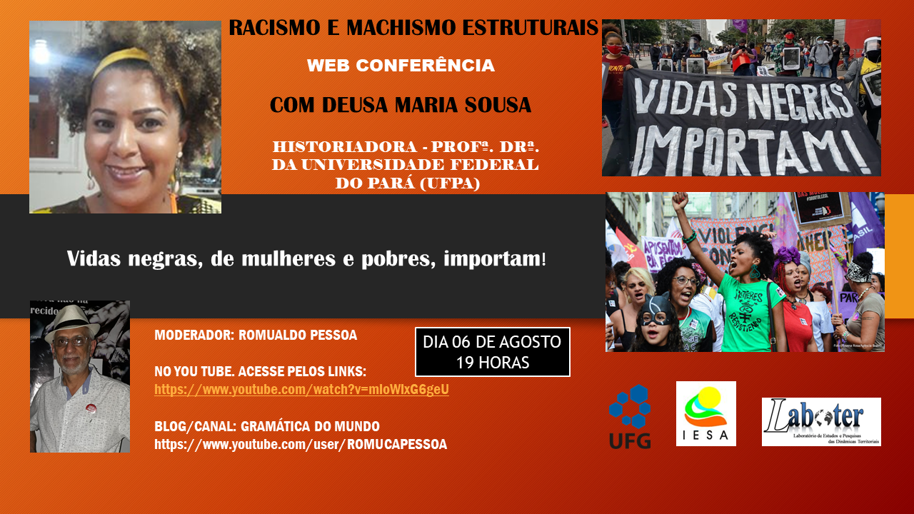 Web Conferência "Racismo e machismo estruturais" Evento Local: https://www.youtube.com/watch?v=mloWlxG6geU Data evento : 06 agosto 2020 alle 19:00 TweetWhatsApp Elenca tutto Volver