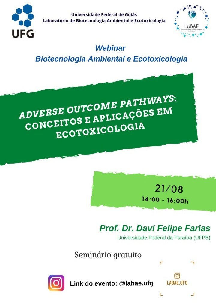 O Laboratório de Biotecnologia Ambiental e Ecotoxicologia (LaBAE), do Instituto de Patologia Tropical e Saúde Pública (IPTSP), da Universidade Federal de Goiás (UFG), coordena um ciclo de Webinar em Biotecnologia Ambiental e Ecotoxicologia. O Webinar é um evento inter-institucional e conta com a colaboração de várias Instituições parceiras, tal como Universidade Estadual de Goiás (UEG), Universidade Federal de Jataí (UFJ) e Universidade Federal de Alagoas (UFAL).
