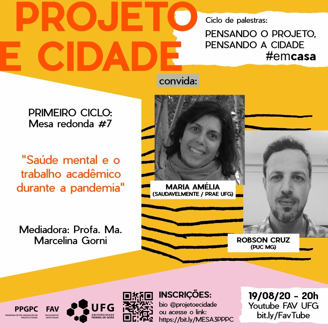 A sétima mesa-redonda será dia 19/08/20 com a professora Maria Amélia (Saudavelmente / Prae UFG e o professor Robson Cruz (PUC MG). A professora Marcelina Gorni (FAV/UFG) fará a mediação.