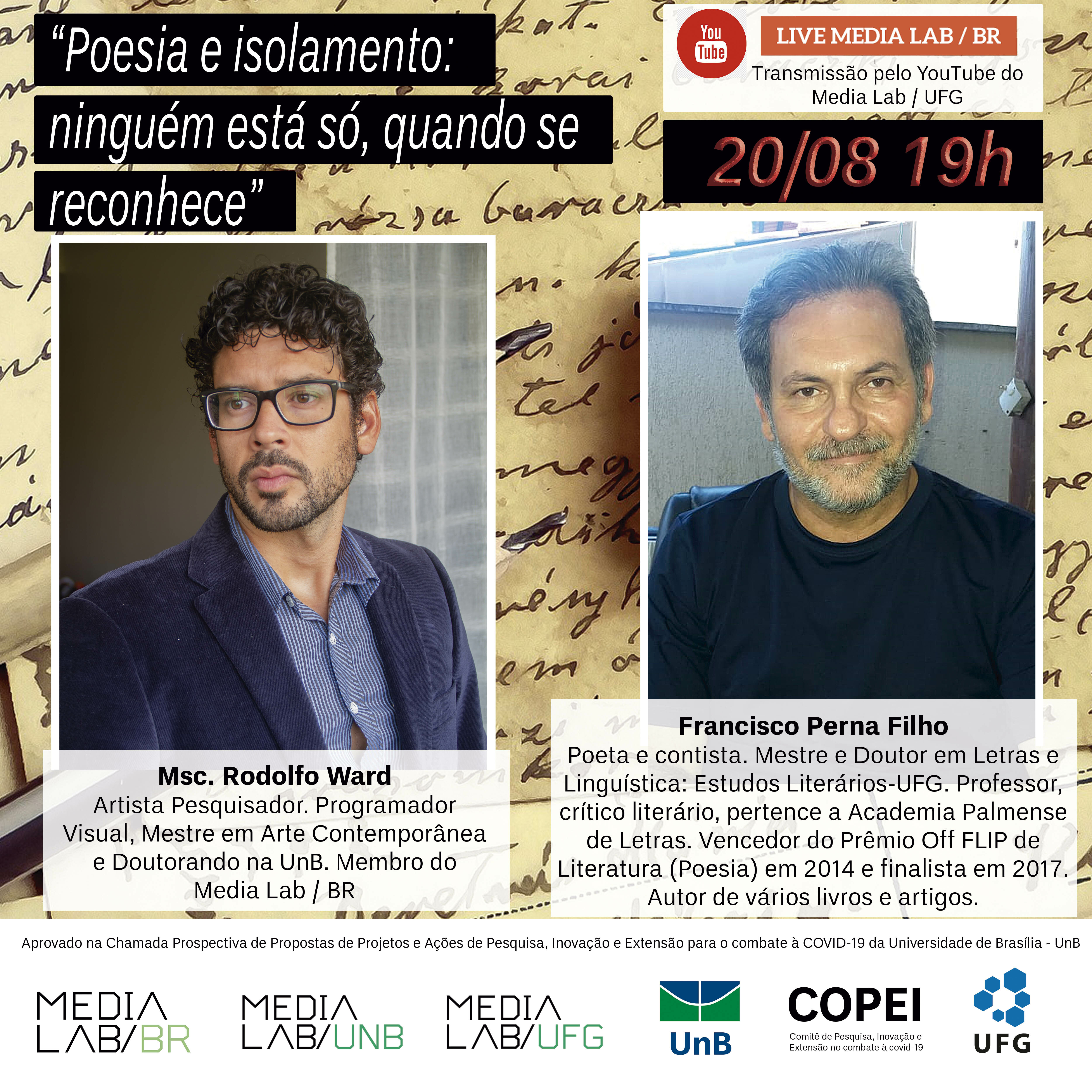 A décima segunda edição do projeto Arte e Inovação em Tempos de Pandemia que é um Projeto de extensão aprovado em edital da UnB. "Poesia e isolamento: ninguém está só, quando se reconhece" com o professor Chico Perna e o doutorando Rodolfo Ward.