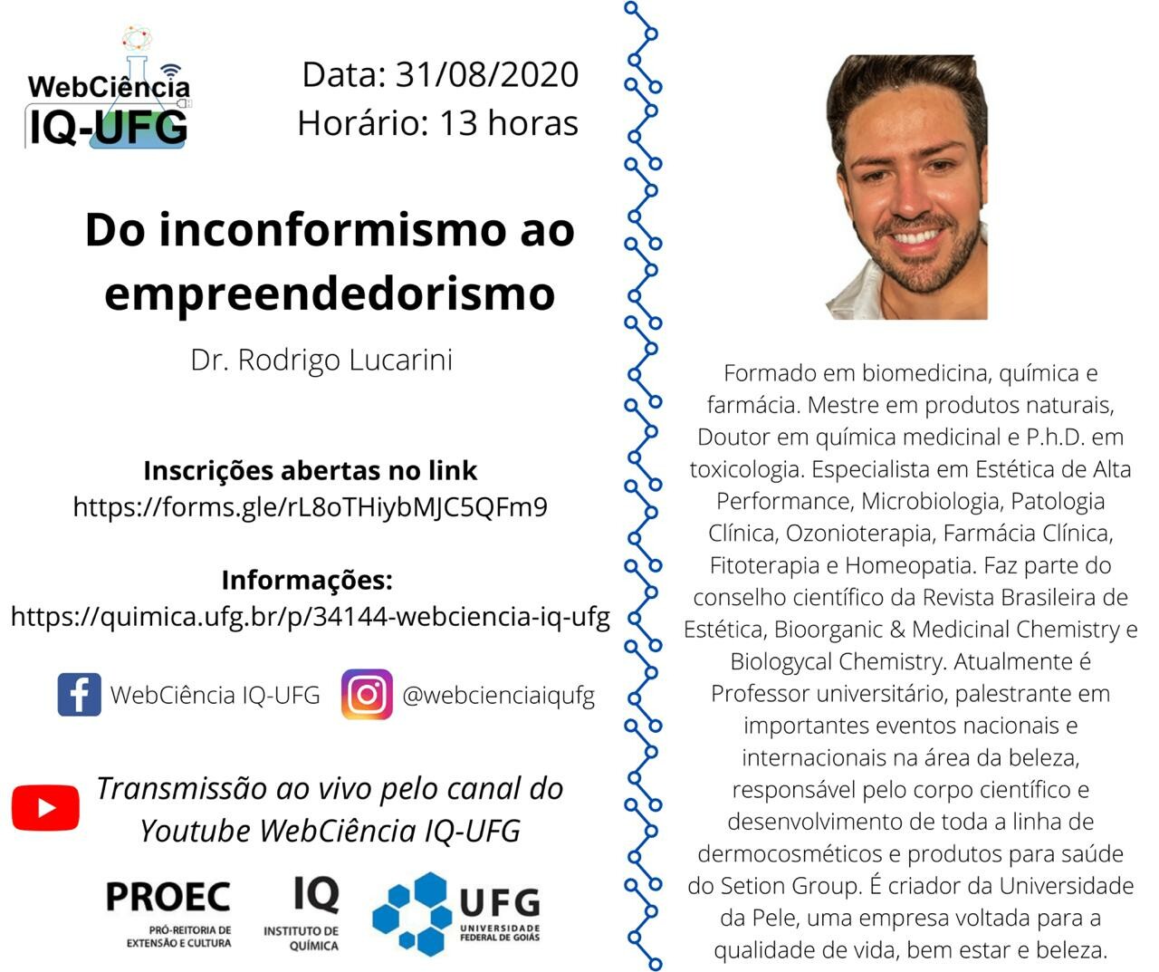 Webinário “Do inconformismo ao empreendedorismo” Evento Local: YouTube WebCiência IQ-UFG Data evento : 31 agosto 2020 alle 13:00 TweetWhatsApp Elenca tutto Volver
