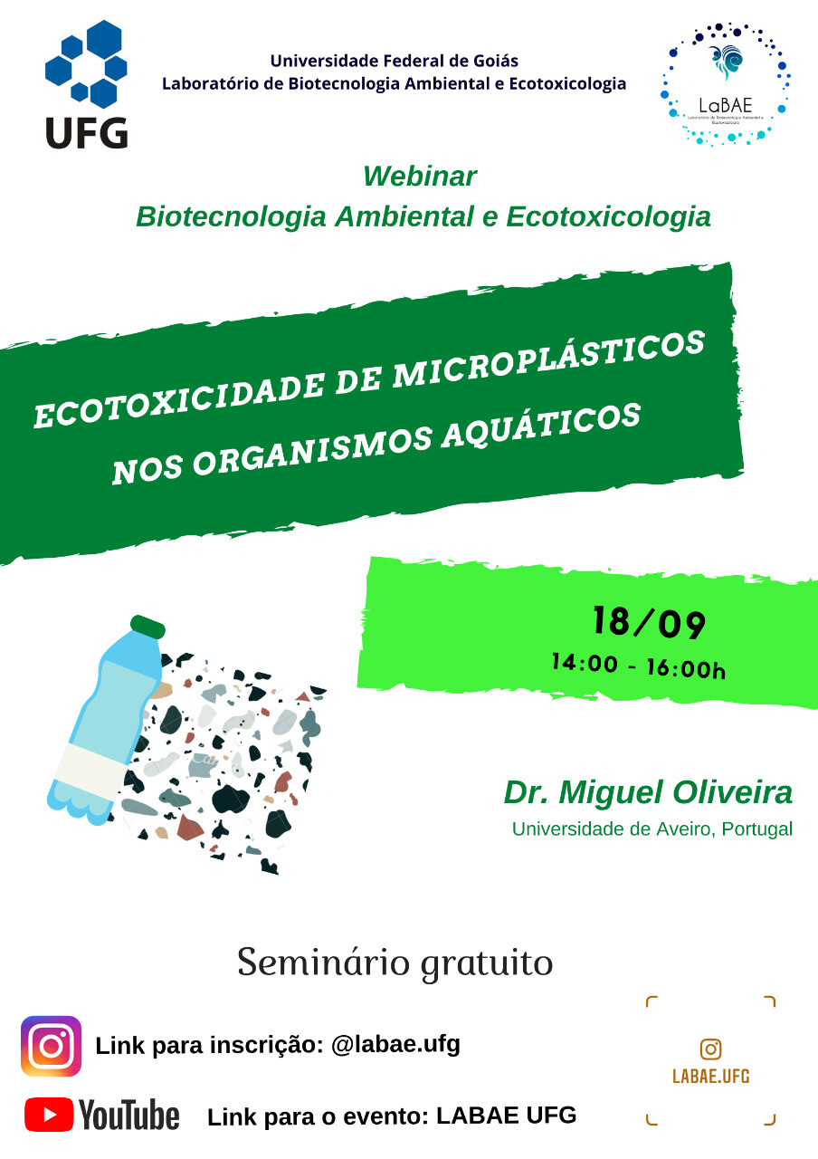 O Laboratório de Biotecnologia Ambiental e Ecotoxicologia (LaBAE), do Instituto de Patologia Tropical e Saúde Pública (IPTSP), da Universidade Federal de Goiás (UFG), coordena um ciclo de Webinar em Biotecnologia Ambiental e Ecotoxicologia. O Webinar é um evento inter-institucional e conta com a colaboração de várias Instituições parceiras, tal como Universidade Estadual de Goiás (UEG), Universidade Federal de Jataí (UFJ) e Universidade Federal de Alagoas (UFAL).