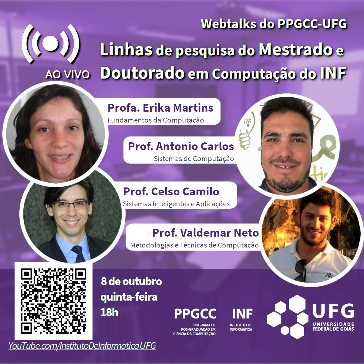 No dia 8 de outubro (quinta-feira), às 18h, no Youtube do Instituto de Informática, será apresentado um painel com a temática: “Linhas de pesquisa do Mestrado e Doutorado em Computação do INF”. A transmissão ao vivo contará com a presença da professora Erika Martins, que falará sobre a linha de pesquisa Fundamentos da Computação, do professor Antonio Carlos Júnior, apresentando a linha Sistemas de Computação, do professor Celso Camilo, sobre a linha Sistemas Inteligentes e Aplicações e do professor Valdemar Neto, que falará sobre a linha Metodologias e Técnicas de Computação. A mesa será mediada pelo professor Wanderley Alencar.