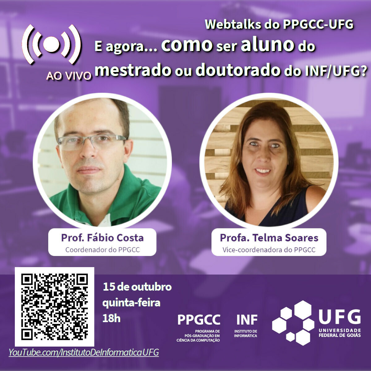 No dia 15 de outubro (quinta-feira), às 18h, no Youtube do Instituto de Informática, será apresentado um painel com a temática: “E agora... Como ser aluno do Mestrado ou Doutorado do INF/UFG?”. A transmissão ao vivo contará com a presença do coordenador do programa de Pós-Graduação em Ciência da Computação da UFG, Prof. Fábio Moreira Costa, e da vice-coordenadora do programa de Pós-Graduação em Ciência da Computação da UFG, Profa. Telma Soares. A mesa será mediada pelo professor Wanderley Alencar.