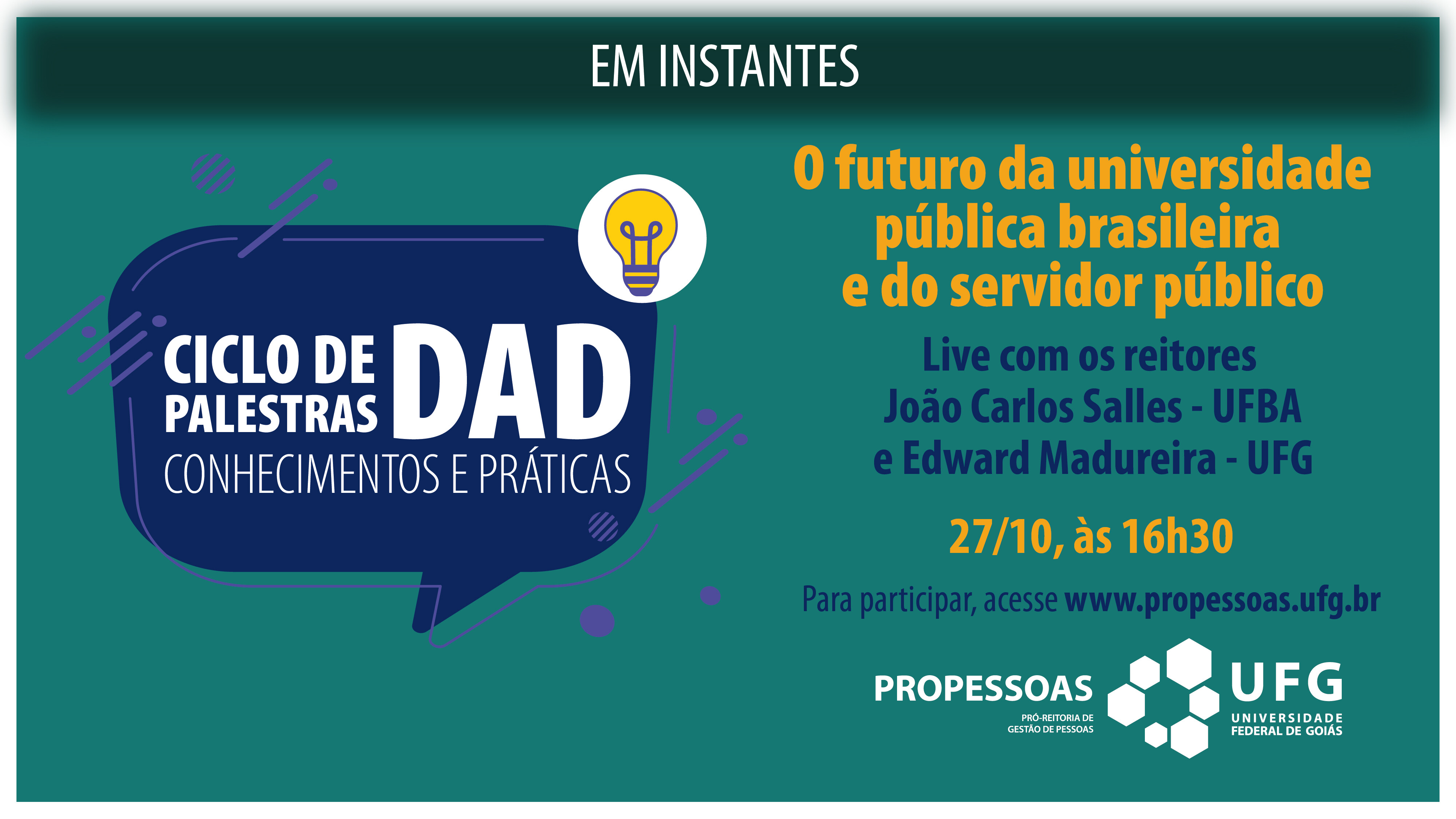 Palestra "O futuro da universidade pública brasileira e do servidor público" Ereignis Local: www.propessoas.ufg.br Ereignisdatum : 27 Oktober, 2020 at 16:30 Para registrar em sua agenda, clique aqui! TweetWhatsApp Alle auflisten zurück