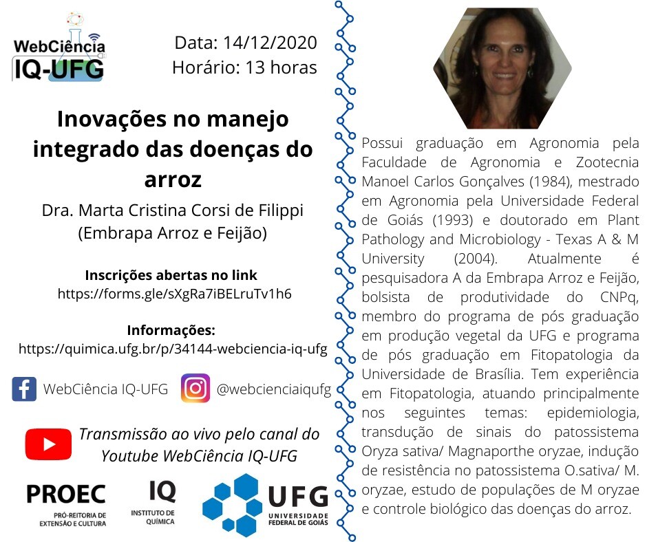 Finalizando o ano de 2020, o WebCiência IQ-UFG receberá a professora Marta Filippi (Embrapa). O tema abordado será sobre “Inovações no manejo integrado das doenças do arroz”.