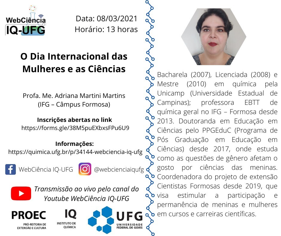 Webinário "O Dia Internacional das Mulheres e as Ciências" com a profa. Adriana Martini Martins no portal UFG
