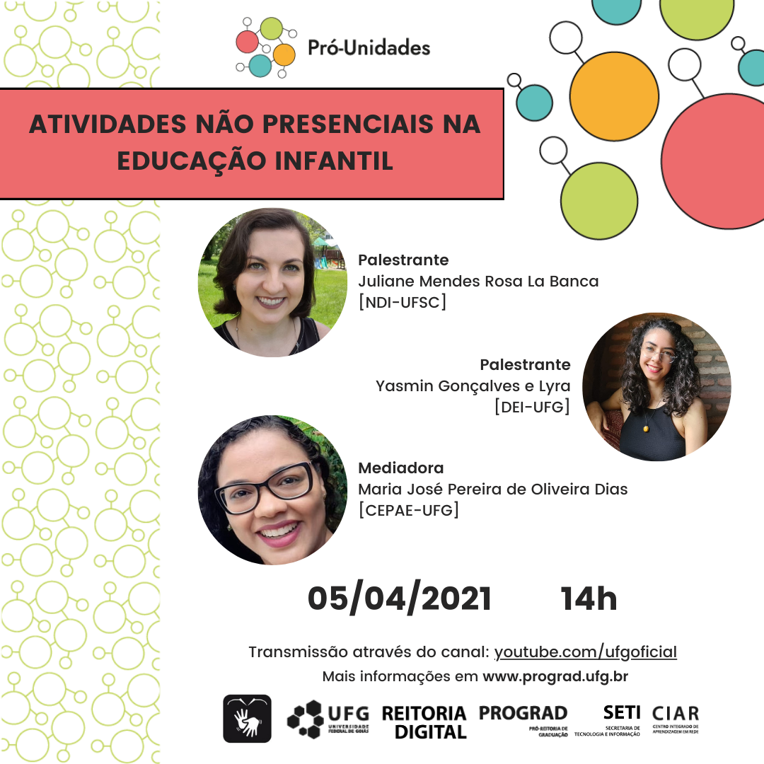 Palestra "Atividades não presenciais na educação infantil" Evento Local: YouTube UFG Oficial Data do Evento : 05 de Abril 2021 às 14:00 TweetWhatsApp Listar Todas Voltar