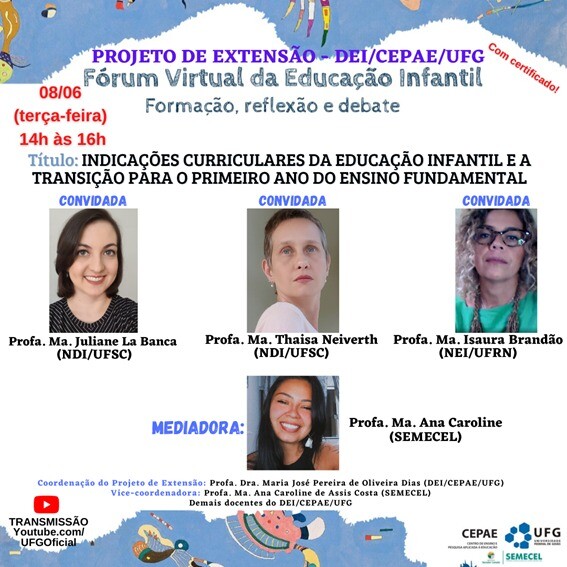 III Encontro do Projeto de Extensão - Fórum Virtual da Educação Infantil: formação, reflexão e debate Evento Local: YouTube UFG Oficial Data evento : 08 giugno 2021 alle 14:00 TweetWhatsApp Elenca tutto Volver