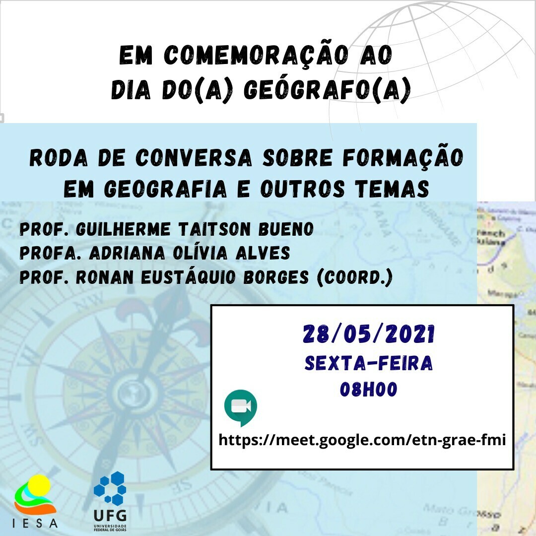 Roda de conversa sobre formação em Geografia e outros temas Event Local: Google Meet Event date : May 28, 2021 at 08:00 Para participar, clique no link TweetWhatsApp List all Back