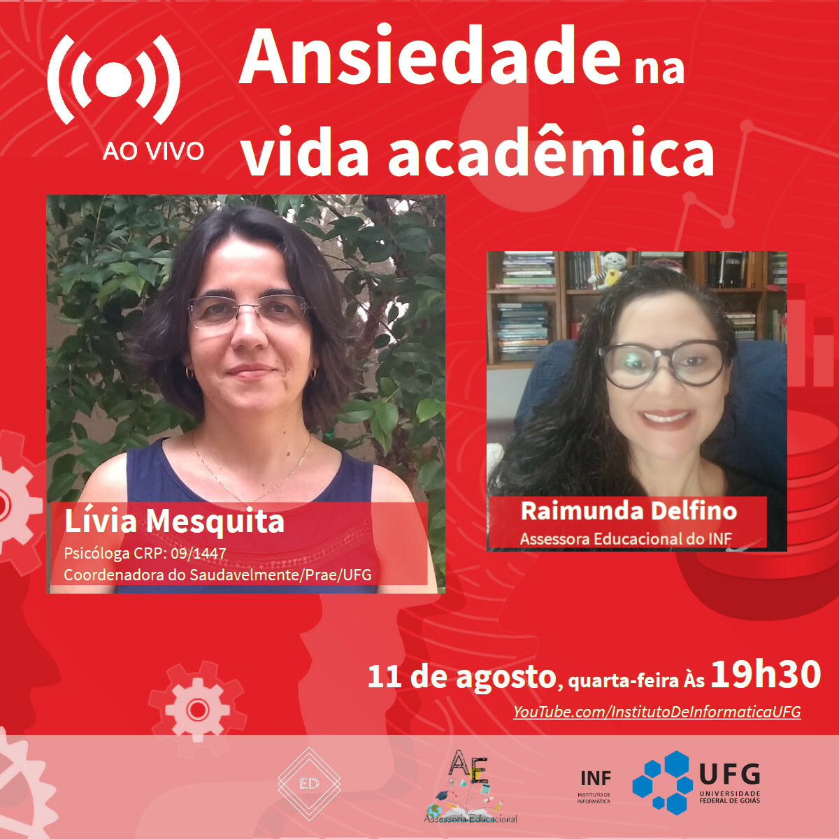 Palestra "Ansiedade na vida acadêmica" Event Local: YouTube Instituto de Informática UFG Event date : August 11, 2021 at 19:30 Clique no link para assistir ao evento TweetWhatsApp List all Back
