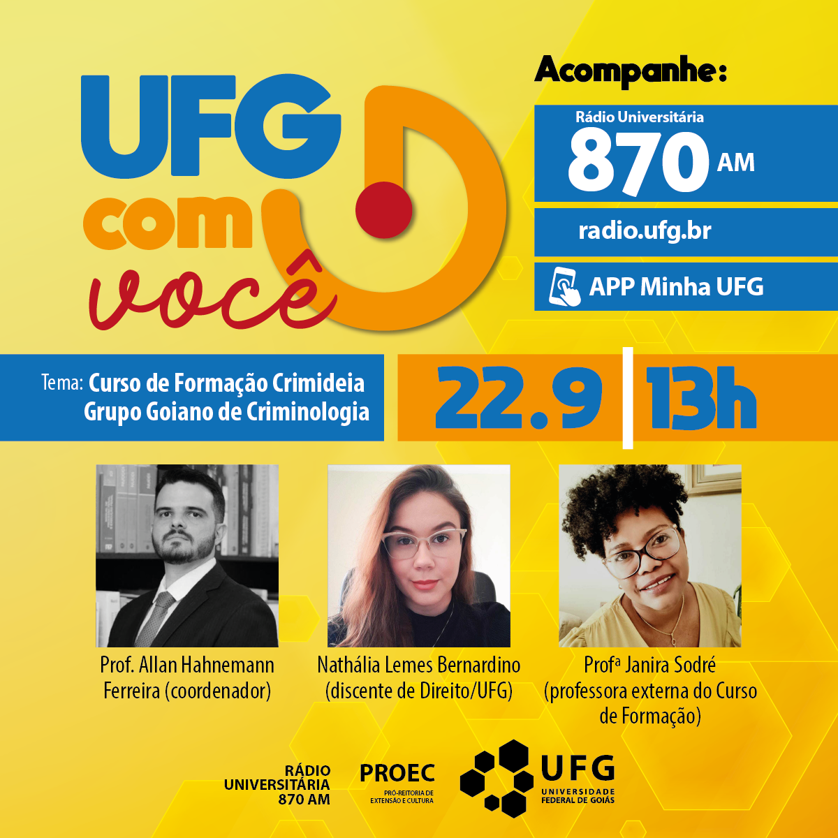 UFG com Você: "curso de formação Crimideia" Evento Local: Rádio Universitária - 870 AM, radio.ufg.br ou App Minha UFG Data do Evento : 22 de Setembro 2021 às 13:00 TweetWhatsApp Listar Todas Voltar