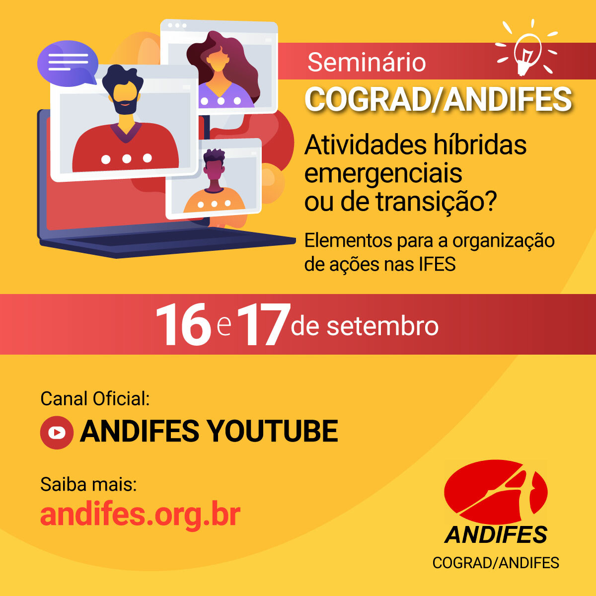 Seminário Cograd/Andifes "Atividades híbridas emergenciais ou de transição?" Evento Local: YouTube UFG Andifes Periodo del Evento : 16 - 17 Setiembre 2021 Para assistir ao evento no dia 16/9, clique aqui Para assistir ao evento no dia 17/9, clique aqui TweetWhatsApp Todas las páginas Volver