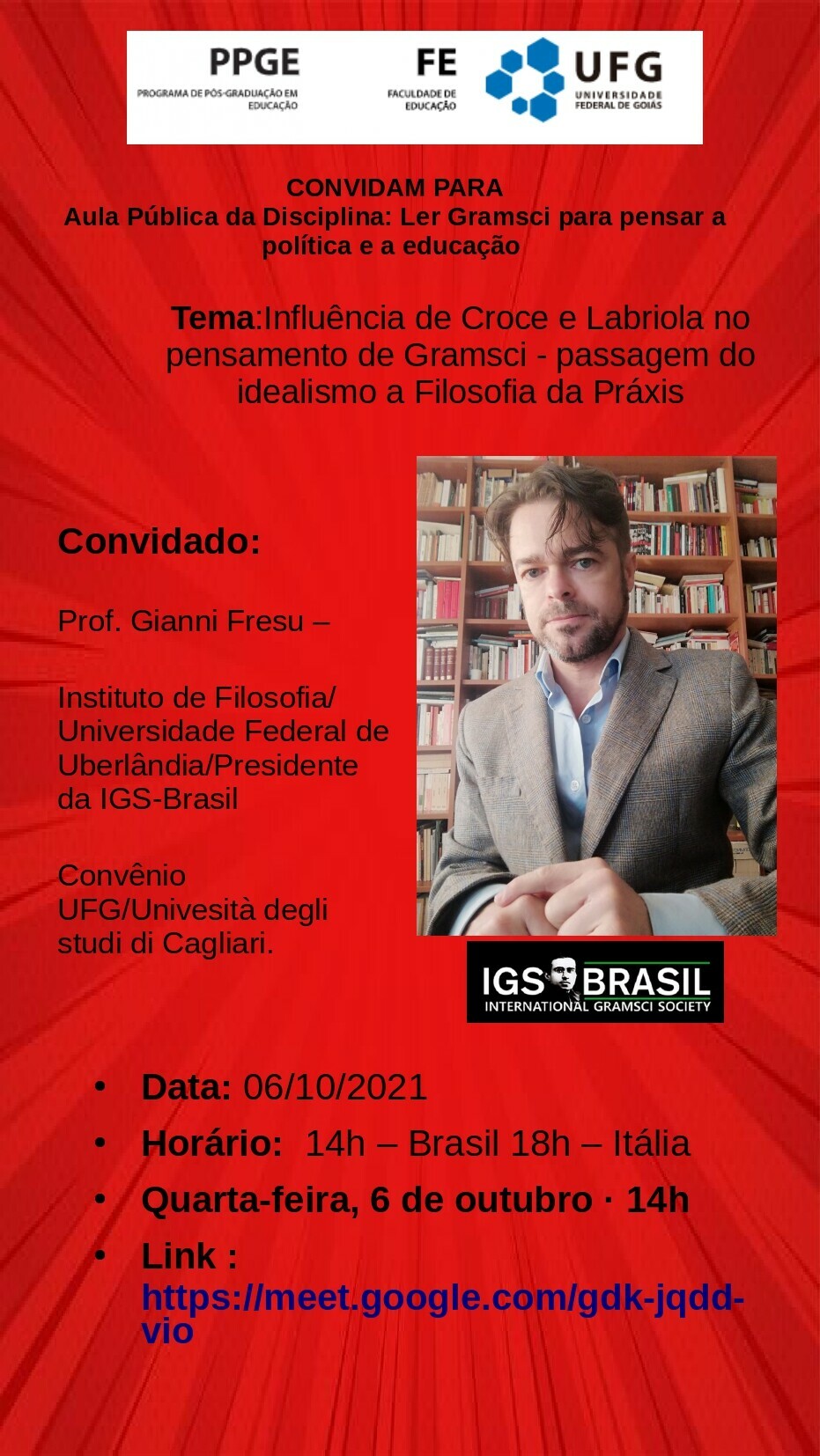 Aula Pública da Disciplina: Ler Gramsci para pensar a política e a educação Evento Local: Google Meet Fecha del Evento : 06 Octubre 2021 a las 16:09 TweetWhatsApp Todas las páginas Volver