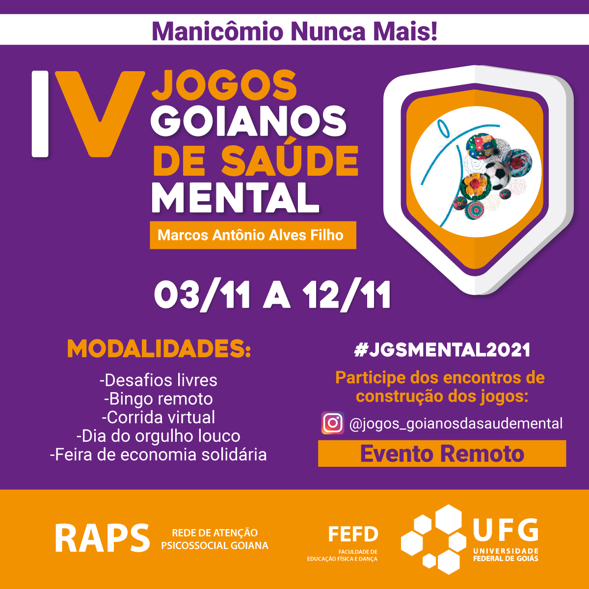 IV Jogos Goianos de Saúde Mental Evento Local: Evento remoto Periodo del Evento : 03 - 12 Noviembre 2021 Para participar dos encontros de construção dos jogos, acesse @jogos_goianosdasaudemental TweetWhatsApp Todas las páginas Volver