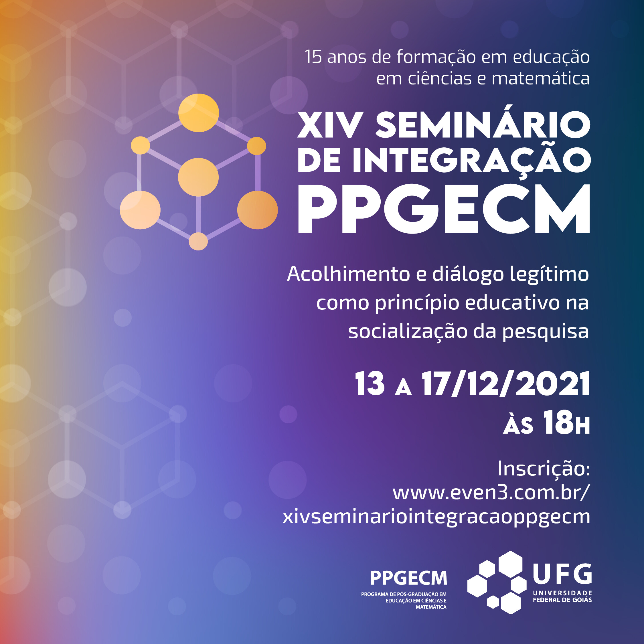 O XIV Seminário de Integração é um evento do Programa de Pós-Graduação em Educação em Ciências e Matemática (PPGECM) da Universidade Federal de Goiás (UFG). Sua finalidade é a socialização dos projetos de pesquisa por parte dos/as doutorandos/as e dos/das mestrandos/das, ao alcançarem a metade do curso, com a comunidade interna e externa ao PPGECM.
