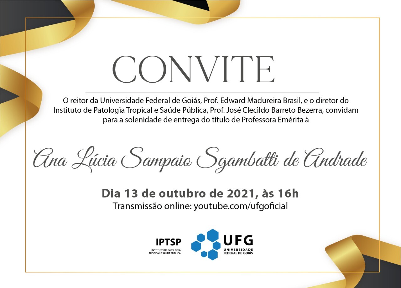 Solenidade de entrega do título de Professora Emérita a Ana Lúcia Sampaio Sgambatti de Andrade Evento Local: YouTube UFG Oficial Data evento : 13 ottobre 2021 alle 16:00 Para registrar em sua agenda, clique aqui Para assistir ao evento, clique aqui TweetWhatsApp Elenca tutto Volver