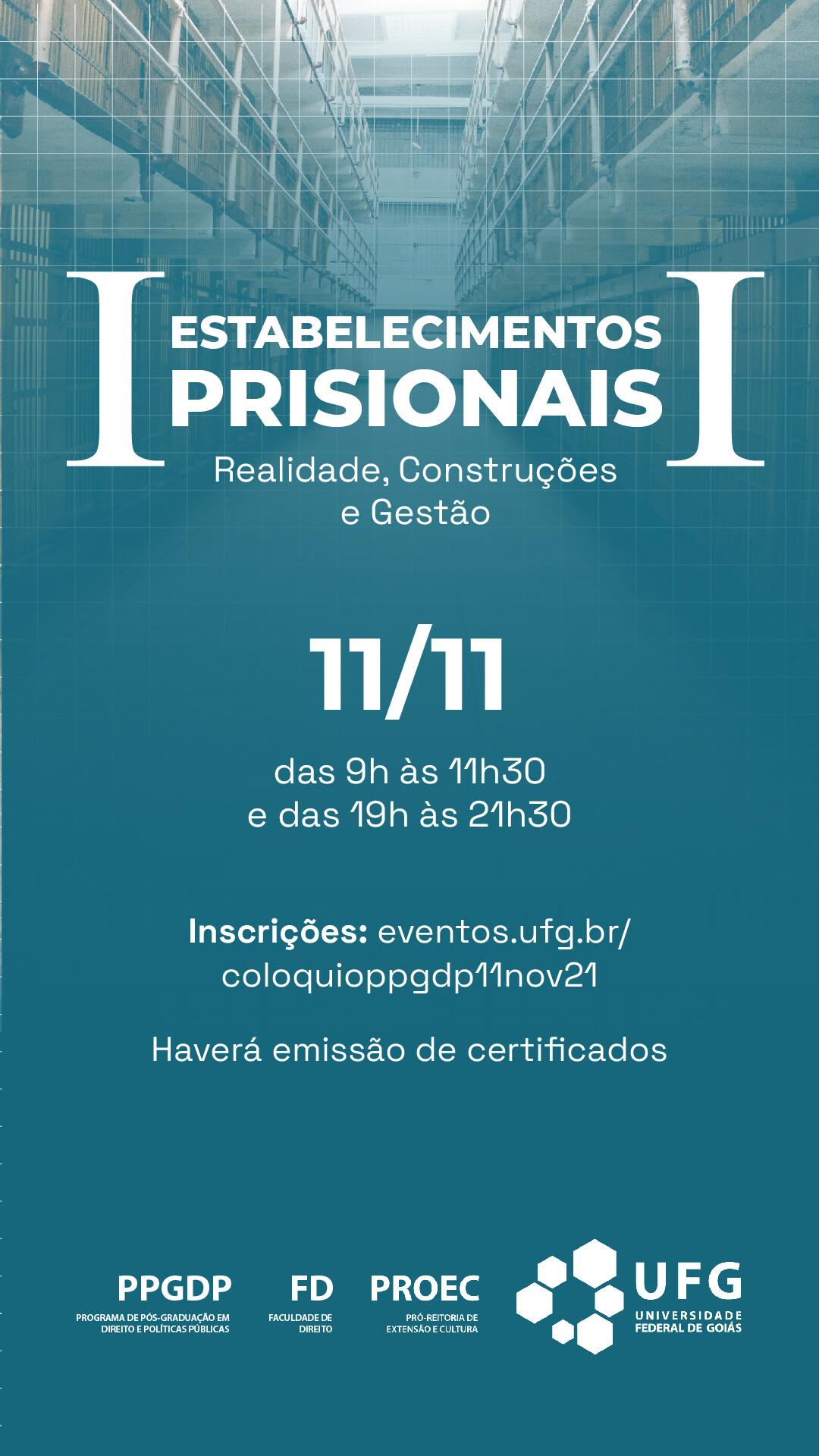 O I Colóquio "Estabelecimentos Prisionais: Realidade, Construções e Gestão", a ser realizado virtualmente no dia 11/11/2021 das 9h às 11h30 e das 19h às 21h30 com Transmissão pelo YouTube UFG Oficial, pretende trazer a debate esse tema inovador que trata de análise das características arquitetônicas de construções civis dos sistemas prisionais atuais, das adequações necessárias dos prédios que abrigam presídios para garantir condições mínimas de permanência e os direitos fundamentais e, ainda, aspectos enfrentados para a gestão desses espaços, a partir da exposição de dados e relatos de experiências dos painelistas convidados.