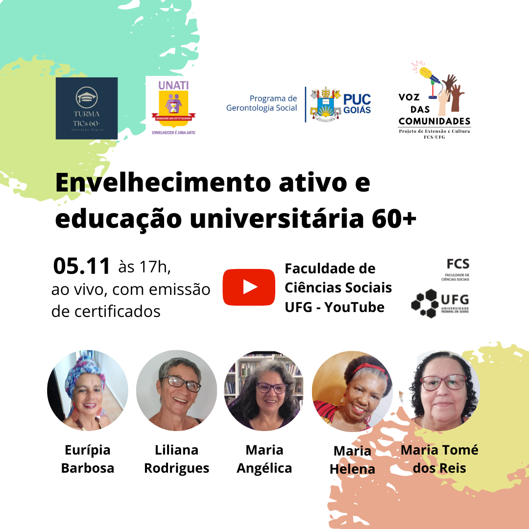 O projeto de extensão Voz das Comunidades e estudantes 60+, convidam para a Live “Envelhecimento ativo e educação universitária 60+”. Vamos escutar as vozes de estudantes 60+ do projeto de extensão Letramento Digital 60+ da UFG e da Universidade Aberta à Terceira Idade-UNATI/PUC Goiás.