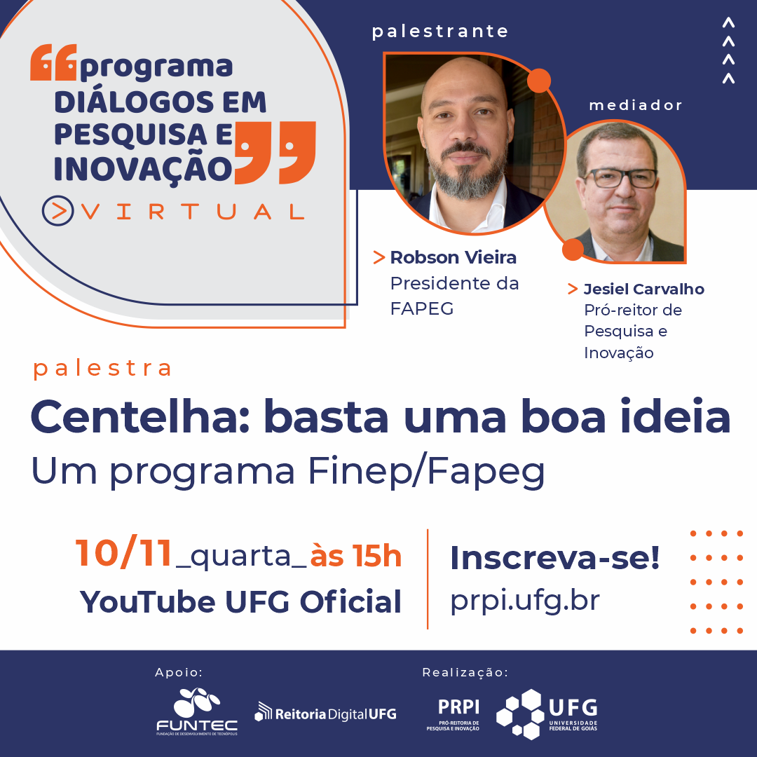 A Pró-Reitoria de Pesquisa e Inovação da UFG, no âmbito do Programa Diálogos em Pesquisa e Inovação, convida a todos para o evento “Centelha: basta uma boa ideia - Um programa Finep/Fapeg”.