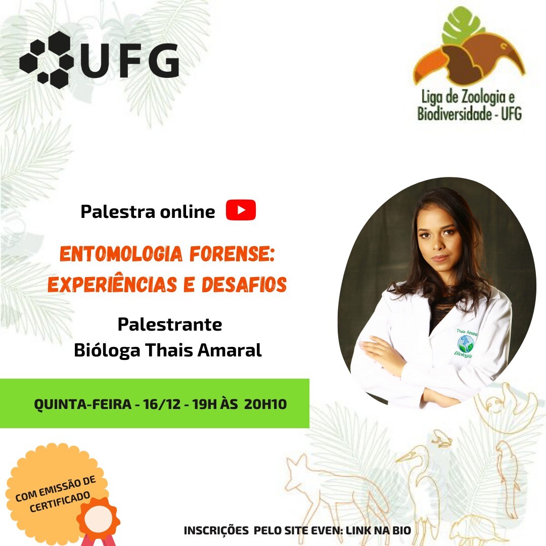 Palestra "Entomologia forense: experiências e desafios" Événement Local: Canal do YouTube Lazbio UFG Date de l'événement : 16 Dezembro 2021 às 19:00 Clique aqui para se inscrever no evento. Para assistir ao evento, clique aqui. TweetWhatsApp Liste tous Voltar