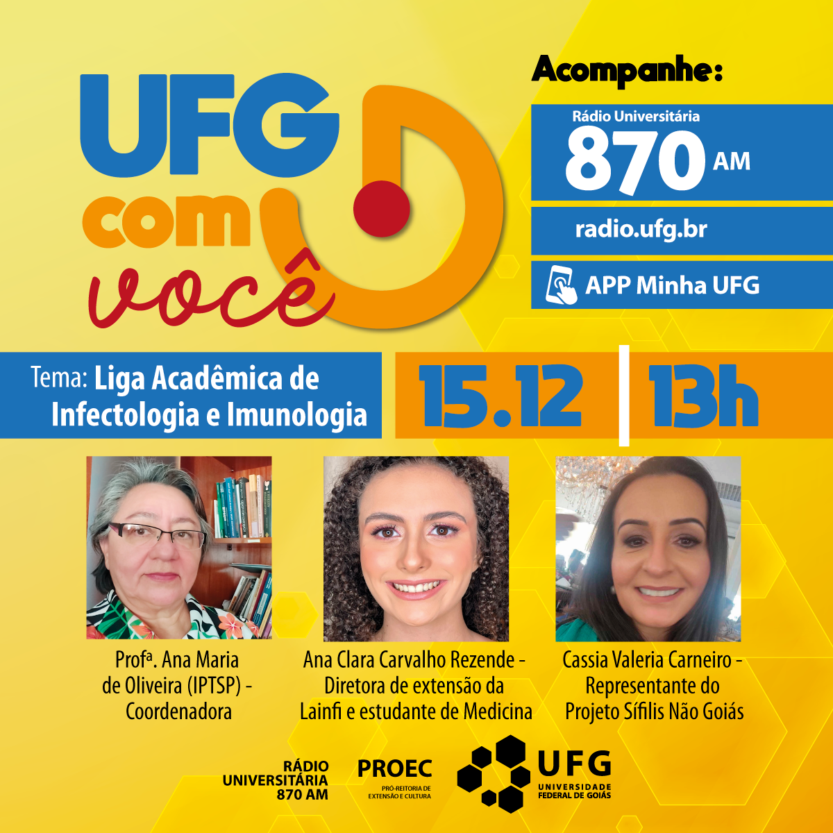 UFG com Você: "Liga Acadêmica de Infectologia e Imunologia" Evento Local: Rádio Universitária - 870 AM, radio.ufg.br e app Minha UFG Fecha del Evento : 15 Diciembre 2021 a las 13:00 TweetWhatsApp Todas las páginas Volver