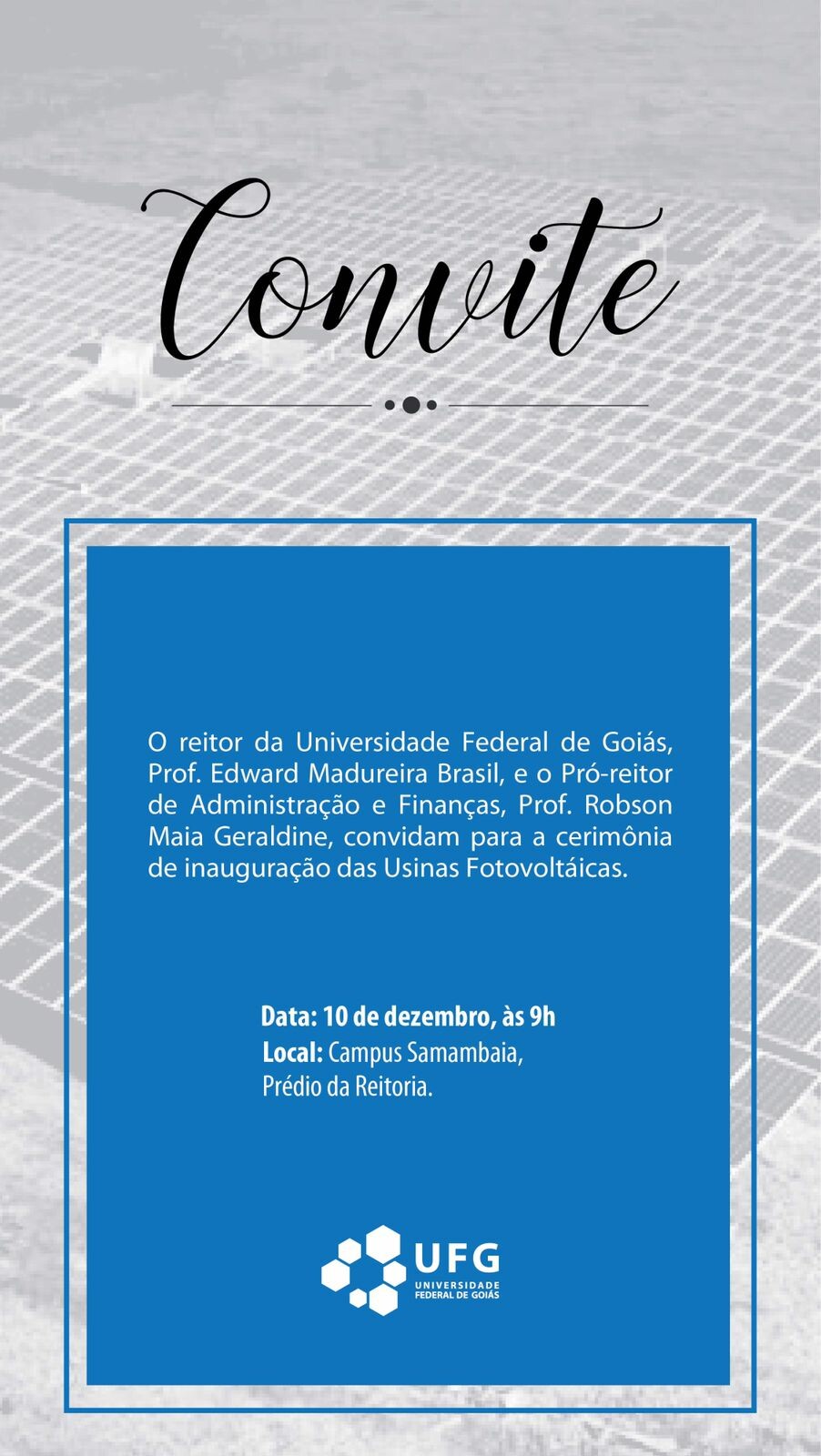 Inauguração das usinas fotovoltaicas da UFG Événement Local: Prédio da Reitoria - Câmpus Samambaia Date de l'événement : 10 Dezembro 2021 às 09:00 TweetWhatsApp Liste tous Voltar