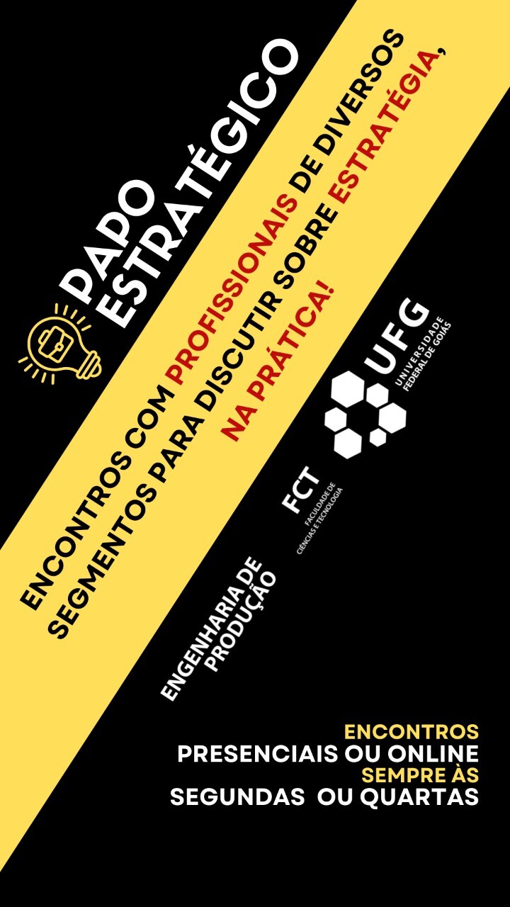 A disciplina de Gestão Estratégica do curso de Engenharia de Produção da Faculdade de Ciências e Tecnologia da Universidade Federal de Goiás (FCT/UFG) - Câmpus de Aparecida, promove a partir de 20 de dezembro de 2021, uma série de encontros com profissionais de diversos segmentos para discutir sobre o gerenciamento estratégico. As aulas são abertas para toda a comunidade e contará com encontros presenciais e online.