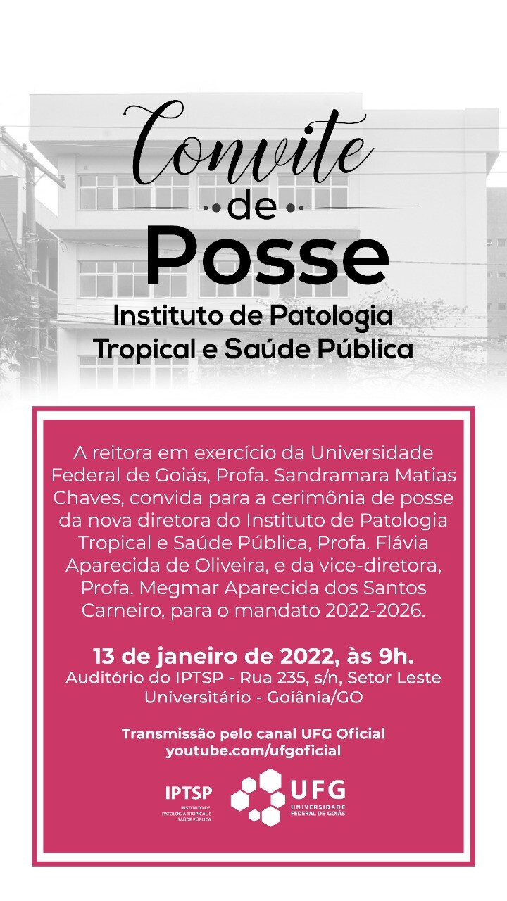Posse do Instituto de Patologia Tropical e Saúde Pública (IPTSP-UFG) Evento Local: Youtube UFG Oficial Fecha del Evento : 13 Enero 2022 a las 09:00 TweetWhatsApp Todas las páginas Volver