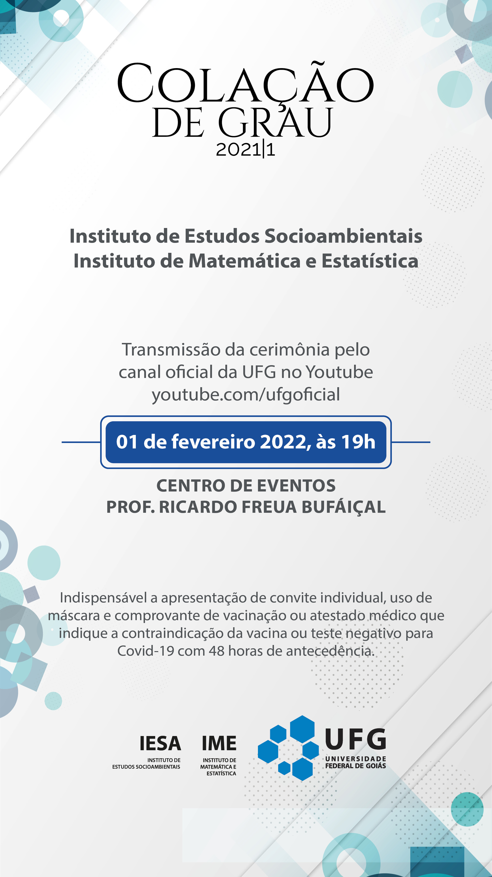 Colação de grau 2021/1 Iesa e IME Evento Local: Centro de Cultura e Eventos Professor Ricardo Freua Bufáiçal - Câmpus Samambaia UFG Data evento : 01 febbraio 2022 alle 19:00 Para assistir ao evento pelo canal do YouTube UFG Oficial, clique aqui. TweetWhatsApp Elenca tutto Volver