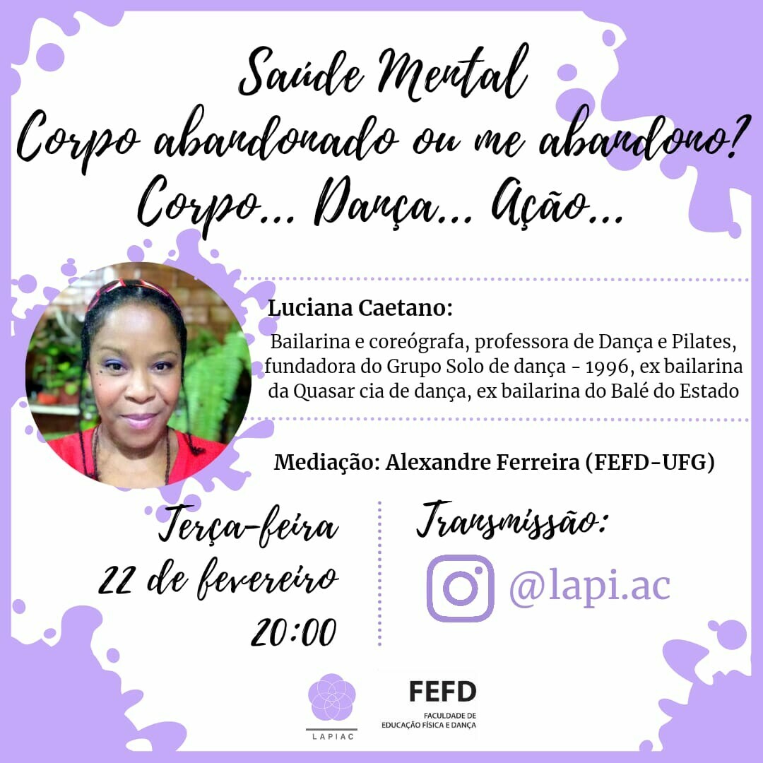 LAPIAC promove encontro "Saúde mental: uma questão pandêmica ou da pandemia? Corpo... Dança... Ação..." com Luciana Caetano Event Local: Evento online Event date : February 22, 2022 at 20:00 TweetWhatsApp List all Back