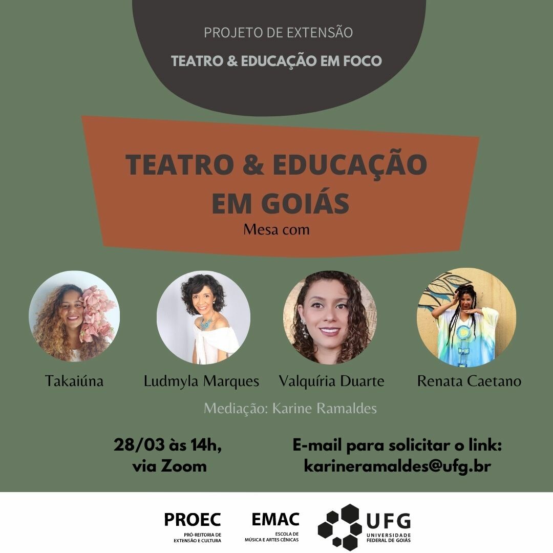 Mesa-redonda "Teatro e educação em Goiás" Event Local: Zoom Event date : March 28, 2022 at 14:00 Para participar, solicite o link da reunião pelo e-mail: karineramaldes@ufg.br TweetWhatsApp List all Back
