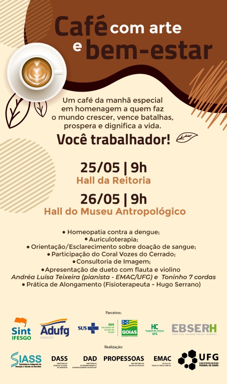 Café com arte e bem-estar Evento Local: Hall da Reitoria e Hall do Museu Antropológico Período do Evento : 25 a 26 de Maio 2022 TweetWhatsApp Listar Todas Voltar