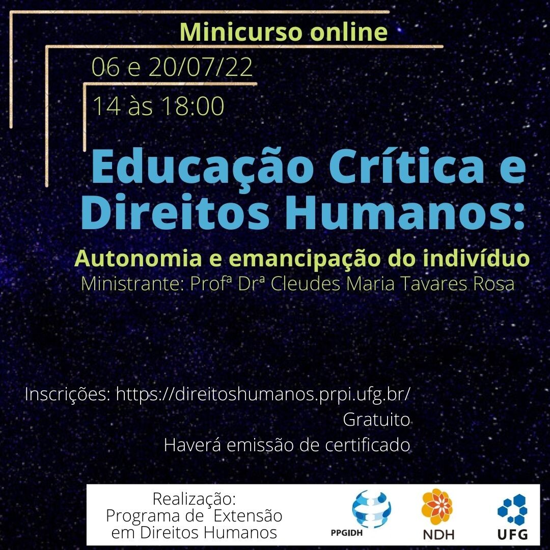 O Programa de Extensão em Direitos Humanos da Universidade Federal de Goiás, vinculado ao Núcleo Interdisciplinar de Estudos e Pesquisas em Direitos Humanos (NDH) e ao Programa de Pós-Graduação Interdisciplinar em Direitos Humanos (PPGIDH), ofertará um minicurso que tem como objetivo discutir a importância da educação crítica na emancipação e autonomia do indivíduo referente à constituição dos Direitos Humanos, recorrendo à Teoria Crítica Frankfurtiana, em específico aos autores Adorno e Horkheimer.