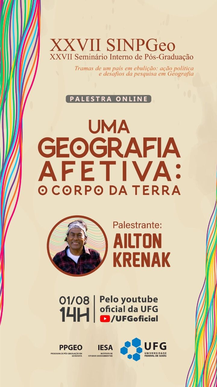 A Comissão Organizadora do XXVII Seminário Interno de Pós-Graduação em Geografia (SINPGeo) informa que essa edição será realizada presencialmente, entre os dias 1º e 4 de agosto. Na abertura, haverá uma palestra online com Ailton Krenak a ser transmitida pelo Canal UFG Oficial no Youtube. As inscrições para o evento podem ser feitas aqui. Mais informações estão na página do Programa de Pós-graduação em Geografia (PPGeo).