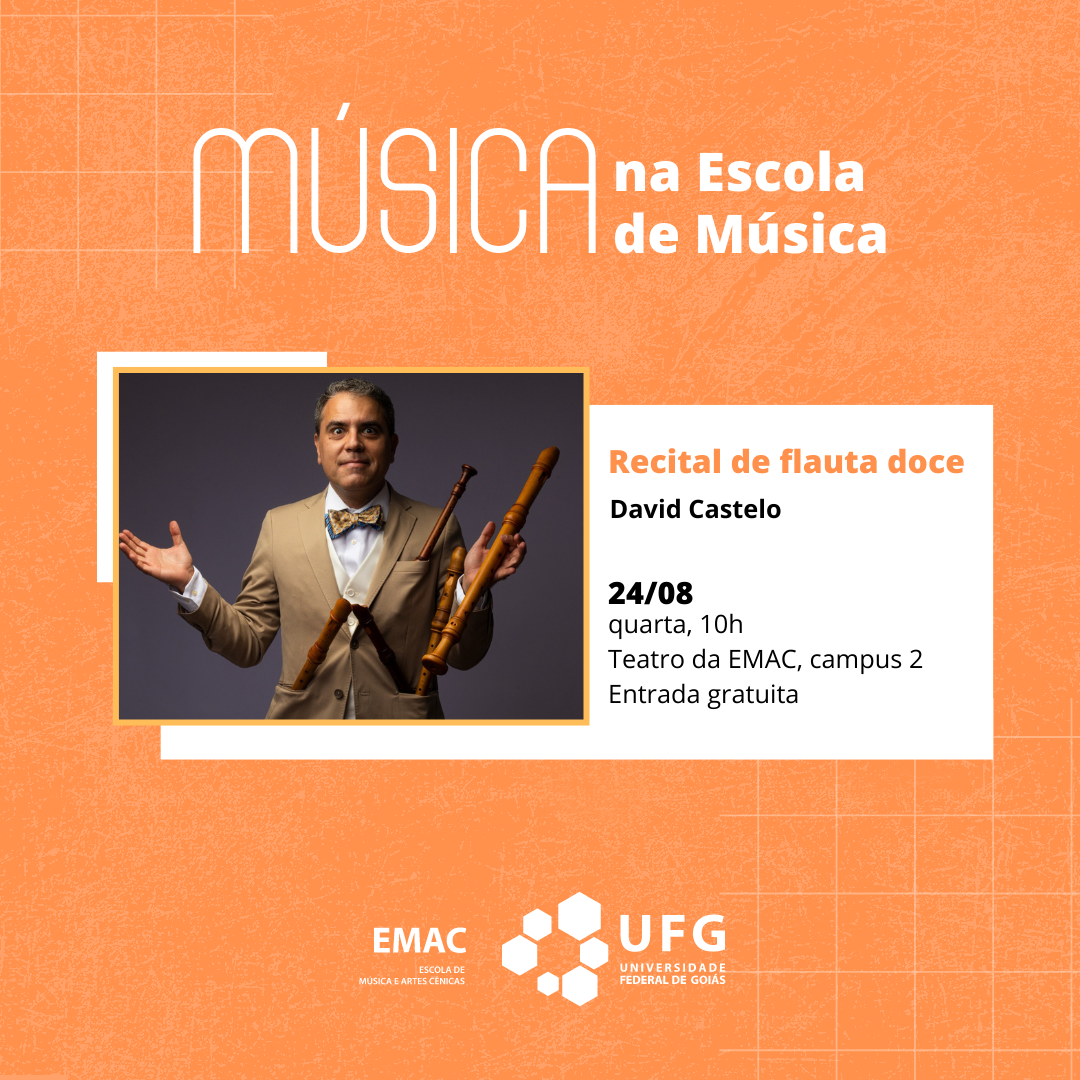 Após dois anos de concertos cancelados, o projeto 'Música na Escola de Música" voltou de forma presencial e aberta ao público desde julho desse ano. Na próxima quarta-feira, dia 24 de agosto, às 10h, no Auditório da EMAC/UFG, no Câmpus Samambaia, em Goiânia, haverá a apresentação do professor da UFG, David Castelo, que é flautista doce. Ele interpretará 10 fantasias do compositor do período barroco Georg Phillip Telemann. A entrada é gratuita, sujeita à lotação do teatro.