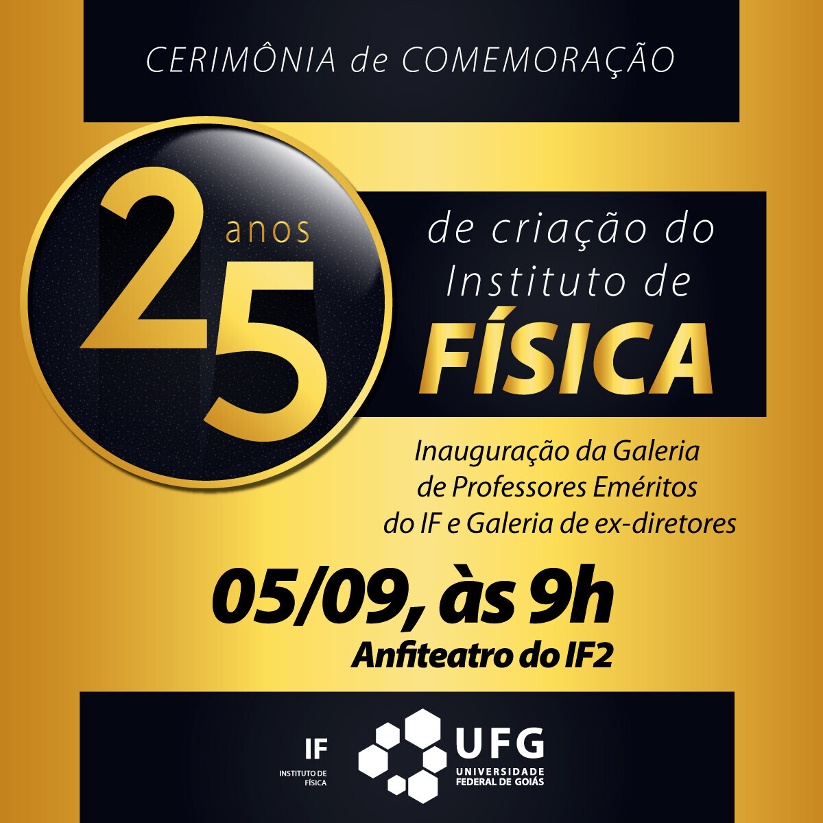 25 anos de criação do Instituto de Física Evento Local: Auditório do IF 2, Câmpus Samambaia Data do Evento : 05 de Setembro 2022 às 09:00 TweetWhatsApp Listar Todas Voltar