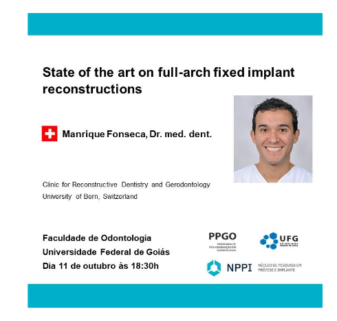 O Núcleo de Pesquisa em Prótese e Implante (NPPI) e o Programa de Pós-Graduação de Odontologia da Faculdade de Odontologia da UFG tem a honra de receber o Prof. Manrique Fonseca. Ele é pós-doutor em prótese dentária, pela Universidade Freiburg, na Alemanha, doutor em Cirurgia Dental, pela Universidad Latina, de San José, Costa Rica, e mestre em Odontologia Reconstrutiva pela Faculdade de Odontologia da Universidade de Berna, Suíça. Além de atuar como professor na disciplina de Prótese Dentária, no departamento de Odontologia Reconstrutiva e Odontogeriatria, da Faculdade de Odontologia da Universidade de Berna, o Prof. Manrique também é especialista em Odontologia Reconstrutiva e Implante, membro docente (fellowship) em Implante, na Universidade Texas A&M, Dallas, Estados Unidos, e Senior Lecturer na Universidade de Berna.