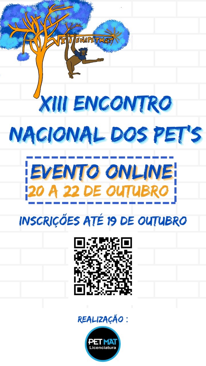 XIII Encontro Nacional de PET´s Evento Local: Encontro Virtual Periodo del Evento : 19 - 22 Octubre 2022 Link do evento: https://www.even3.com.br/enapetmat/ TweetWhatsApp Todas las páginas Volver