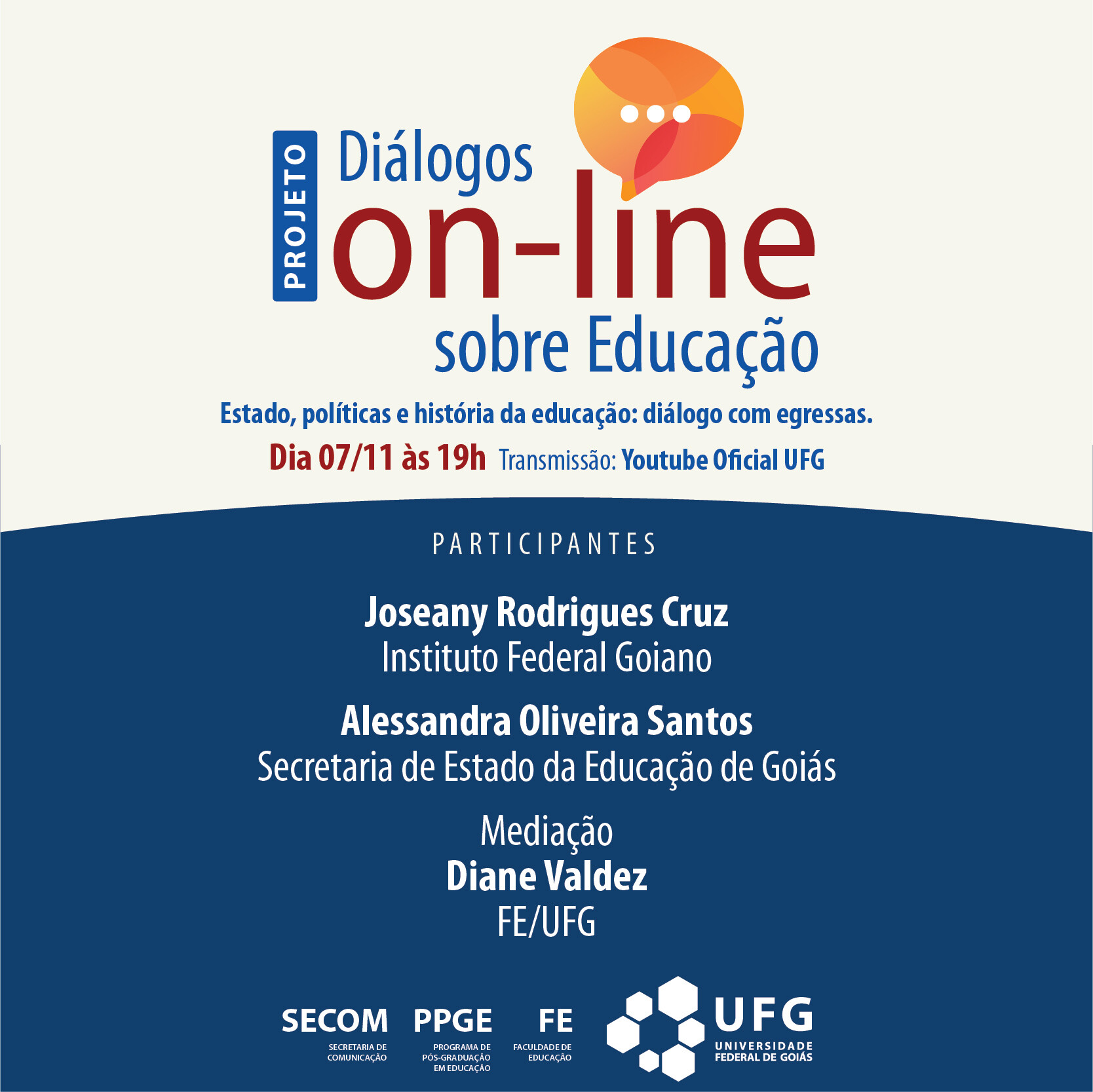 Projeto Diálogos on-line sobre Educação - "Estado, políticas e história da educação: diálogo com egressas" Evento Local: Youtube Oficial UFG Data evento : 07 novembre 2022 alle 19:00 TweetWhatsApp Elenca tutto Volver