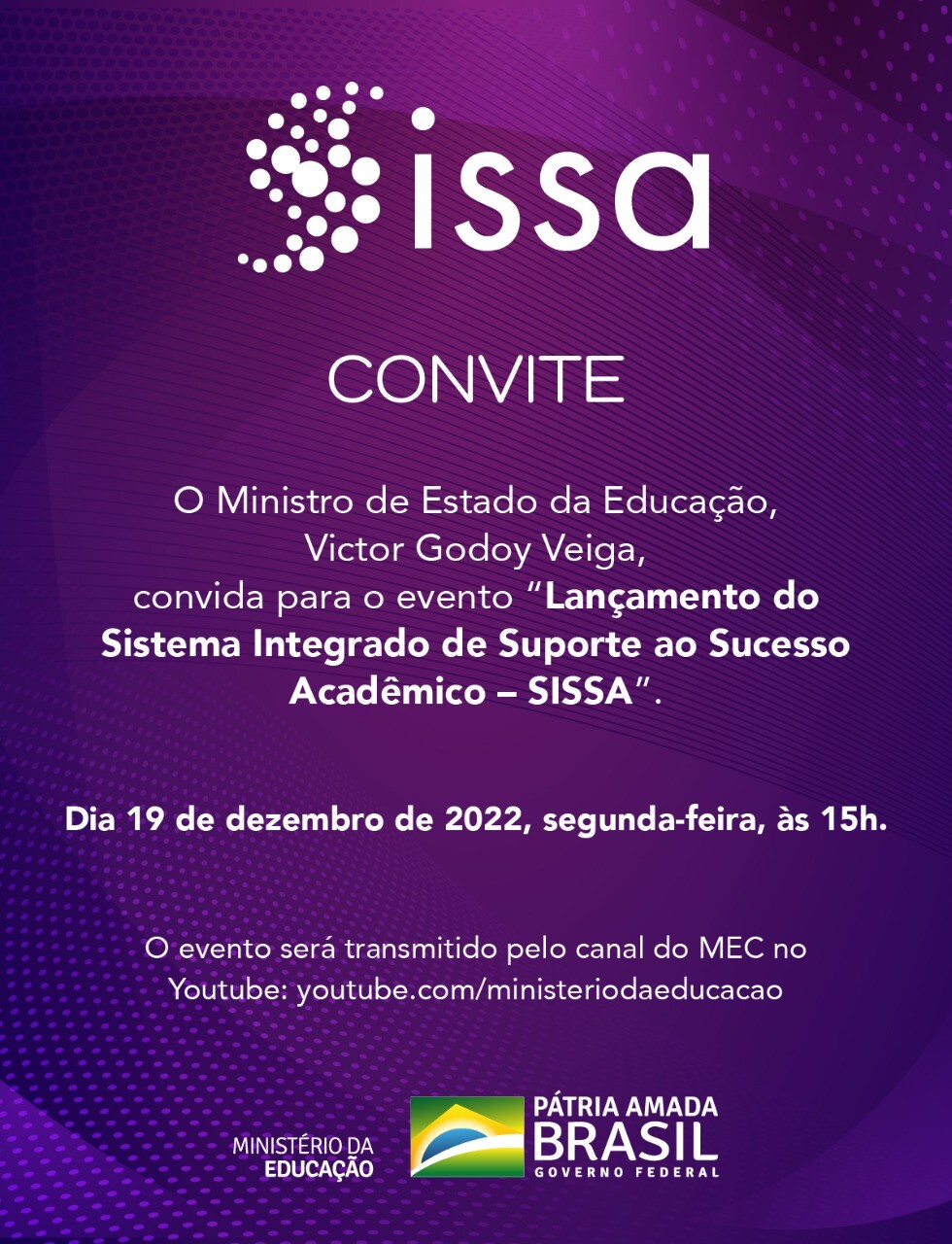 Lançamento do Sistema Integrado de Suporte ao Sucesso Acadêmico (Sissa) Event Local: YouTube Ministério da Educação Event date : December 19, 2022 at 15:00 Clique aqui para acompanhar a transmissão do evento. Caption TweetWhatsApp List all Back