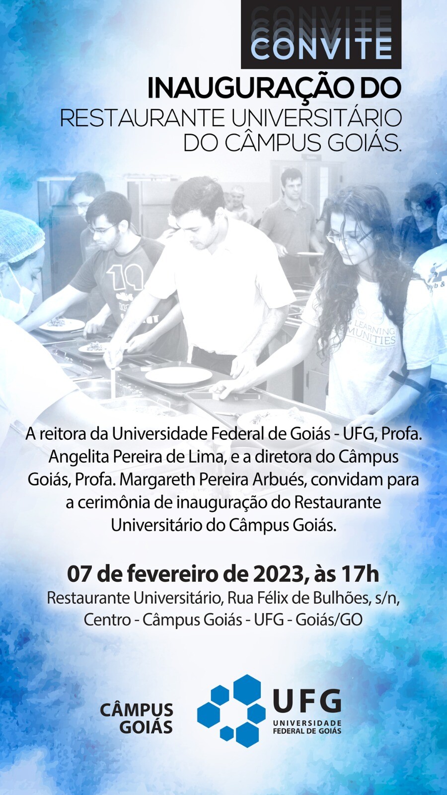 #DescriçãoDaImagem: Convite com o fundo de tons azul celestial e branco. Na parte superior lê-se “Convite: Inauguração do Restaurante Universitário do Campus Goiás. Logo após, tem uma imagem preto e branco de jovens servindo comida no prato. Ao centro o seguinte texto “A reitora da Universidade Federal de Goiás-UFG, Profa. Angelita Pereira de Lima, e a diretora do Campus Goiás, Profa. Margareth Pereira Arbués, convidam para a cerimônia de inauguração do Restaurante Universitário do Campus Goiás”. A parte inferior contém informações “07 de Fevereiro de 2023, às 17h. Restaurante Universitário, Rua Félix de Bulhões, s/n, Centro- Campus Goiás- UFG - Goiás/GO. No final da imagem está a logo do Campus Goiás. Fim da descrição.